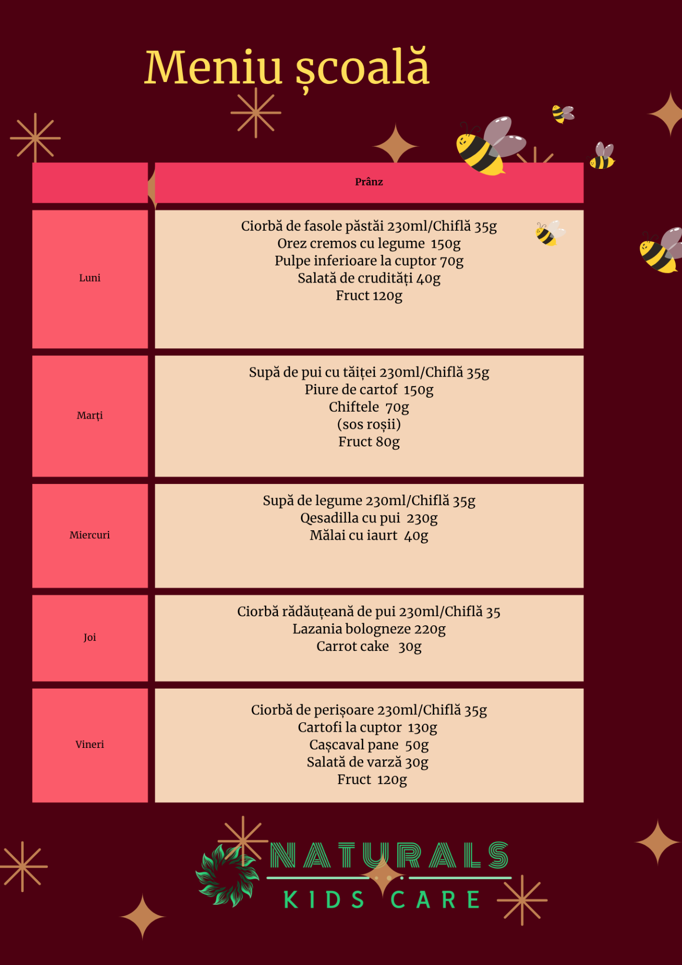 Oferim zilnic copiilor un prânz proaspăt,echilibrat și gătit cu grijă.Folosim ingrediente de calitate și meniuri variate,potrivite vârstei școlare.